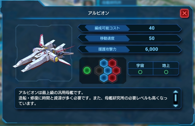 Lv10:アルビオン/コスト40/移動50/援護6000/搭載前3・後3/燃料8万/鋼材7万/電力7万/