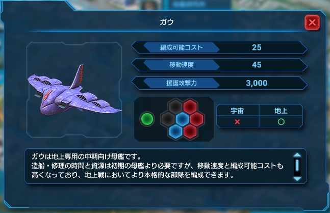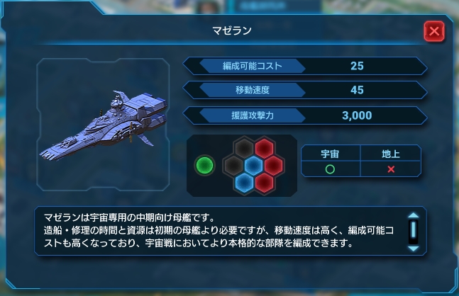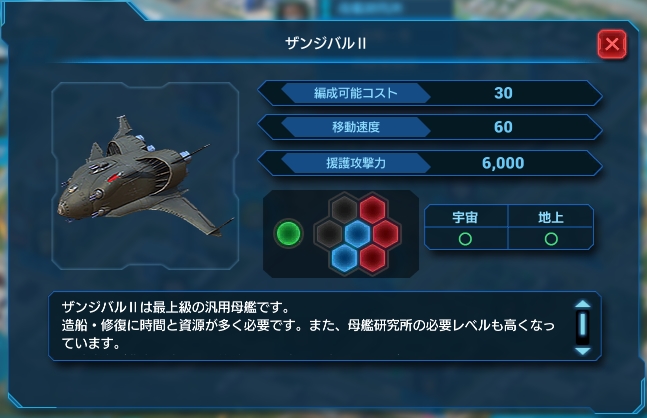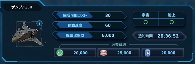 Lv9:ザンジバルⅡ/コスト35/移動60/援護6000/搭載前3・後3/燃料7万/鋼材8万/電力7万/