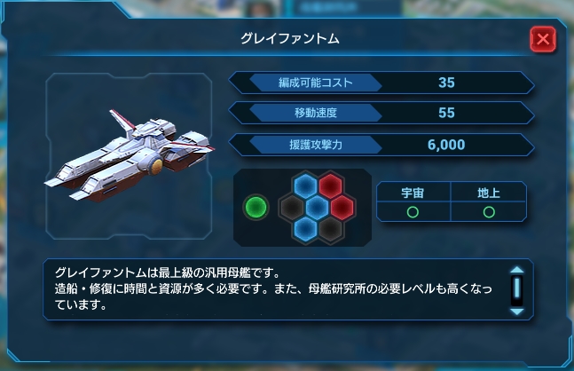 Lv8:グレイファントム/コスト35/移動50/援護6000/搭載前3・後3/燃料3万/鋼材3万/電力3万/