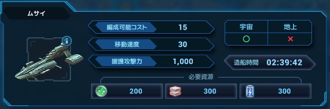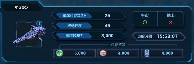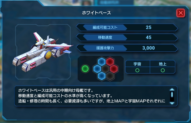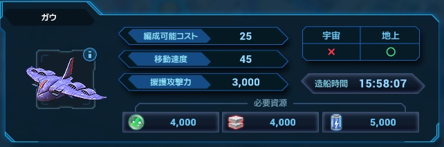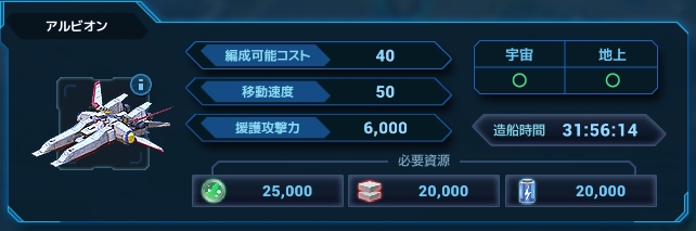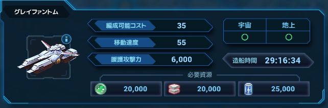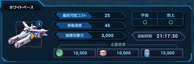 建造時間は造船所Lv5でホワイトベース約20時間、グレイファントム約30時間、ザンジバルⅡとアルビオンが約60時間と大幅増加している。 --