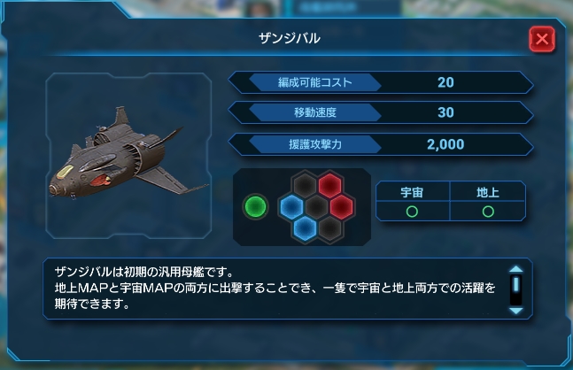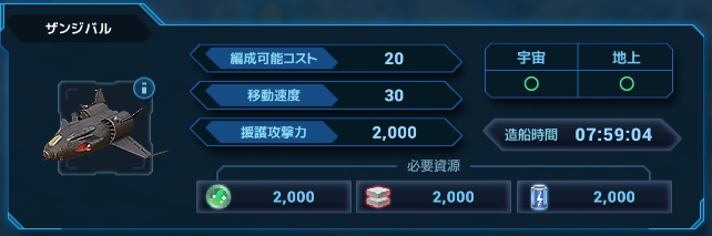 Lv9:ザンジバルⅡ/コスト35/移動60/援護6000/搭載前3・後3/燃料7万/鋼材8万/電力7万/